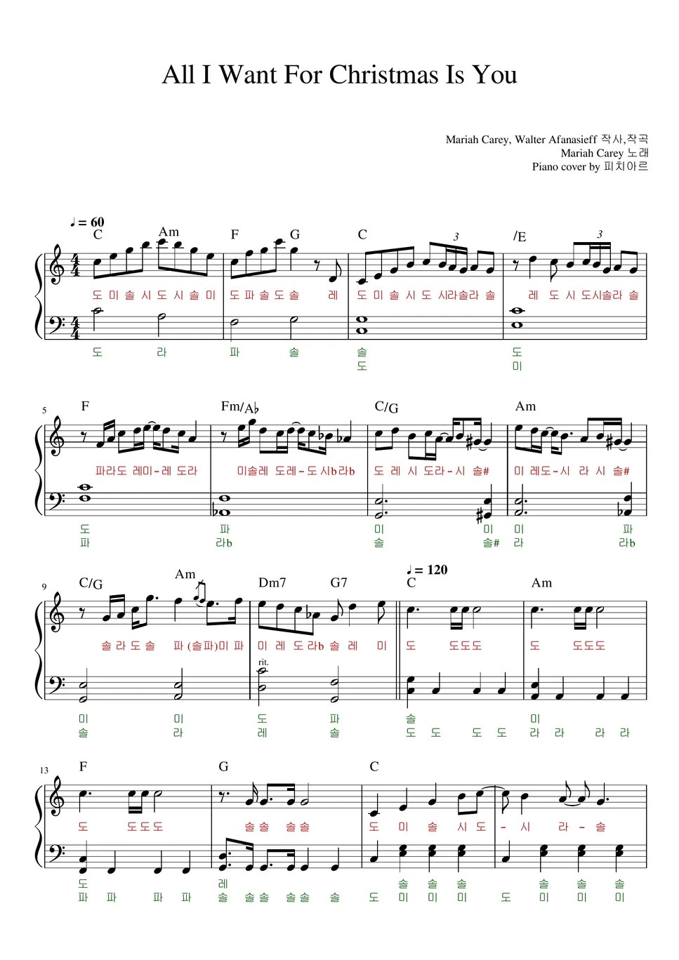 Mariah Carey(머라이어 캐리) All I Want For Christmas Is You (쉬운 계이름 악보) Sheet by 피치아르
