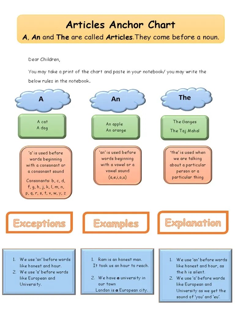 Articles Anchor Chart (the, a, an) Grammar for kids, English phonics, English lessons for kids