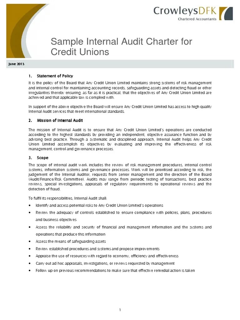 Sample Internal Audit Charter For Credit Unions PDF Internal Audit Internal Control