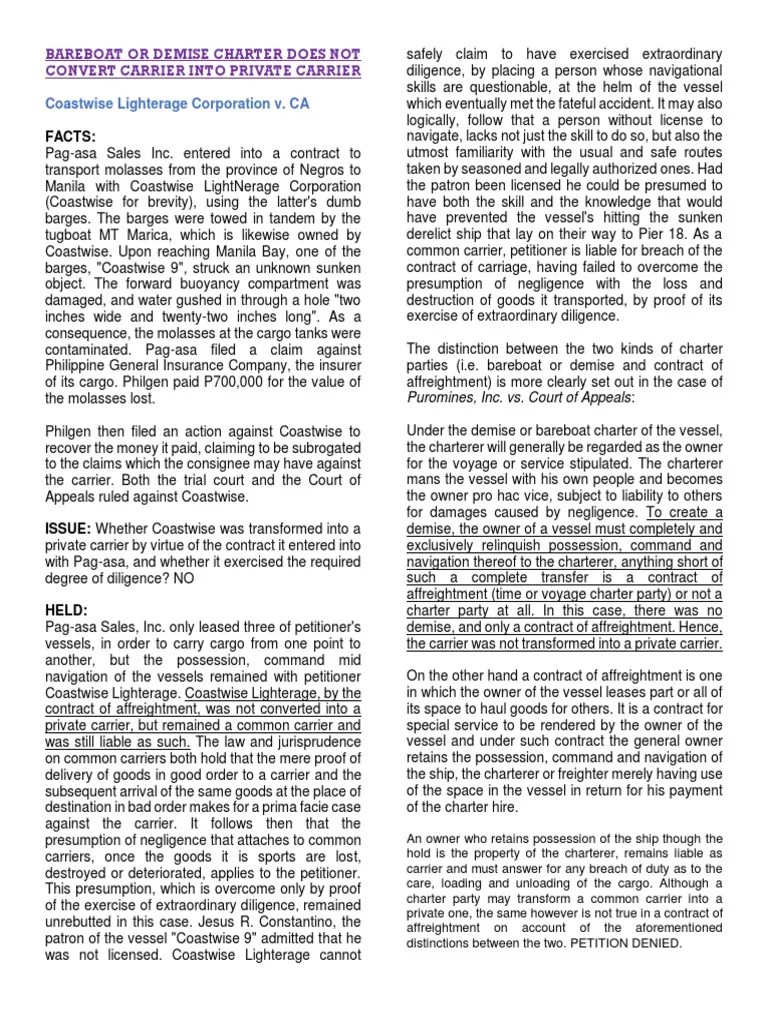 Bareboat or Demise Charter Does Not Convert Carrier Into Private Carrier PDF Common Carrier