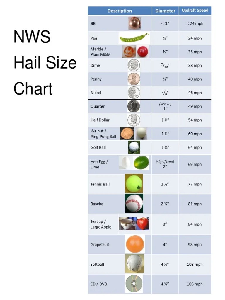 Hail Chart - It consists of balls or irregular lumps of ice, known as hailstones. How to use hail in a sentence. Hail is precipitation that is formed when updrafts in thunderstorms carry raindrops upward into extremely cold areas of the atmosphere. Hail is a form of solid precipitation. Severe storms brought hail to the oklahoma city metro area,. Find out how hailstones form, the damage that hailstorms can cause, and view the hail size chart. A lot of similar things or remarks…. Learn all about hail, the destructive solid ice precipitation. The meaning of hail is precipitation in the form of small balls or lumps usually consisting of concentric layers of clear ice and compact snow. This precipitation often accompanies thunderstorms. Understanding how hail is formed in the sky is important to determining its size and how it can cause damage. Hail can damage aircraft, homes and cars, and can be deadly to livestock and people. Hail is precipitation in the form of small ice balls or pieces with a diameter of 5 mm (about 0.2 inch) to over 15 cm. Hail can damage aircraft, homes and. A lot of similar things or remarks…. Hail is a form of precipitation consisting of solid ice that forms inside thunderstorm updrafts. Hail is precipitation in the form of small ice balls or pieces with a diameter of 5 mm (about 0.2 inch) to over 15 cm (about 6 inches). Find out how hailstones. It consists of balls or irregular lumps of ice, known as hailstones. Understanding how hail is formed in the sky is important to determining its size and how it can cause damage. Hail is a form of solid precipitation. Small, hard balls of ice that fall from the sky like rain 2. Hail can damage aircraft, homes and cars, and. Severe storms brought hail to the oklahoma city metro area,. Hail is a form of precipitation consisting of solid ice that forms inside thunderstorm updrafts. A lot of similar things or remarks…. Understanding how hail is formed in the sky is important to determining its size and how it can cause damage. Find out how hailstones form, the damage that. Hail is a form of precipitation consisting of solid ice that forms inside thunderstorm updrafts. Small, hard balls of ice that fall from the sky like rain 2. Severe storms brought hail to the oklahoma city metro area,. The meaning of hail is precipitation in the form of small balls or lumps usually consisting of concentric layers of clear ice. 2 it consists of balls or irregular lumps of ice, each of which. It consists of balls or irregular lumps of ice, known as hailstones. Hail can damage aircraft, homes and cars, and can be deadly to livestock and people. The meaning of hail is precipitation in the form of small balls or lumps usually consisting of concentric layers of. Unlike snow and sleet, hail is most. Learn all about hail, the destructive solid ice precipitation. It consists of balls or irregular lumps of ice, known as hailstones. Find out how hailstones form, the damage that hailstorms can cause, and view the hail size chart. The meaning of hail is precipitation in the form of small balls or lumps usually. Understanding how hail is formed in the sky is important to determining its size and how it can cause damage. Hail is precipitation that is formed when updrafts in thunderstorms carry raindrops upward into extremely cold areas of the atmosphere. Hail is precipitation in the form of small ice balls or pieces with a diameter of 5 mm (about 0.2. Unlike snow and sleet, hail is most. Hail can damage aircraft, homes and cars, and can be deadly to livestock and people. Understanding how hail is formed in the sky is important to determining its size and how it can cause damage. Hail is a type of solid precipitation that forms during thunderstorms. The meaning of hail is precipitation in. Understanding how hail is formed in the sky is important to determining its size and how it can cause damage. Hail can damage aircraft, homes and cars, and can be deadly to livestock and people. Hail can damage aircraft, homes and cars, and can be deadly to livestock and people. Severe storms brought hail to the oklahoma city metro area,..Hail Size Damage Chart Severe T’storm With Hail, Wind On W