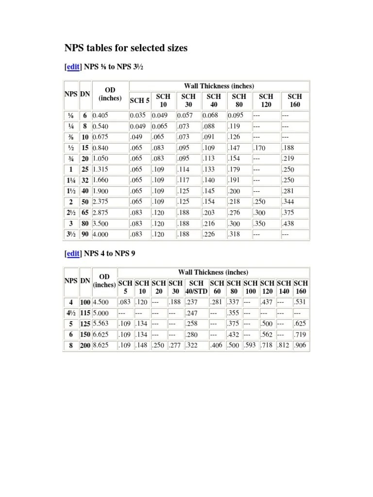 STANDARD PIPE NPS SCH THICKNESS OD ID CHART EngTank