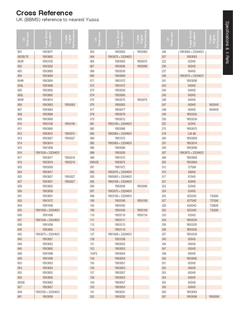 Yuasa Battery Cross Reference Chart